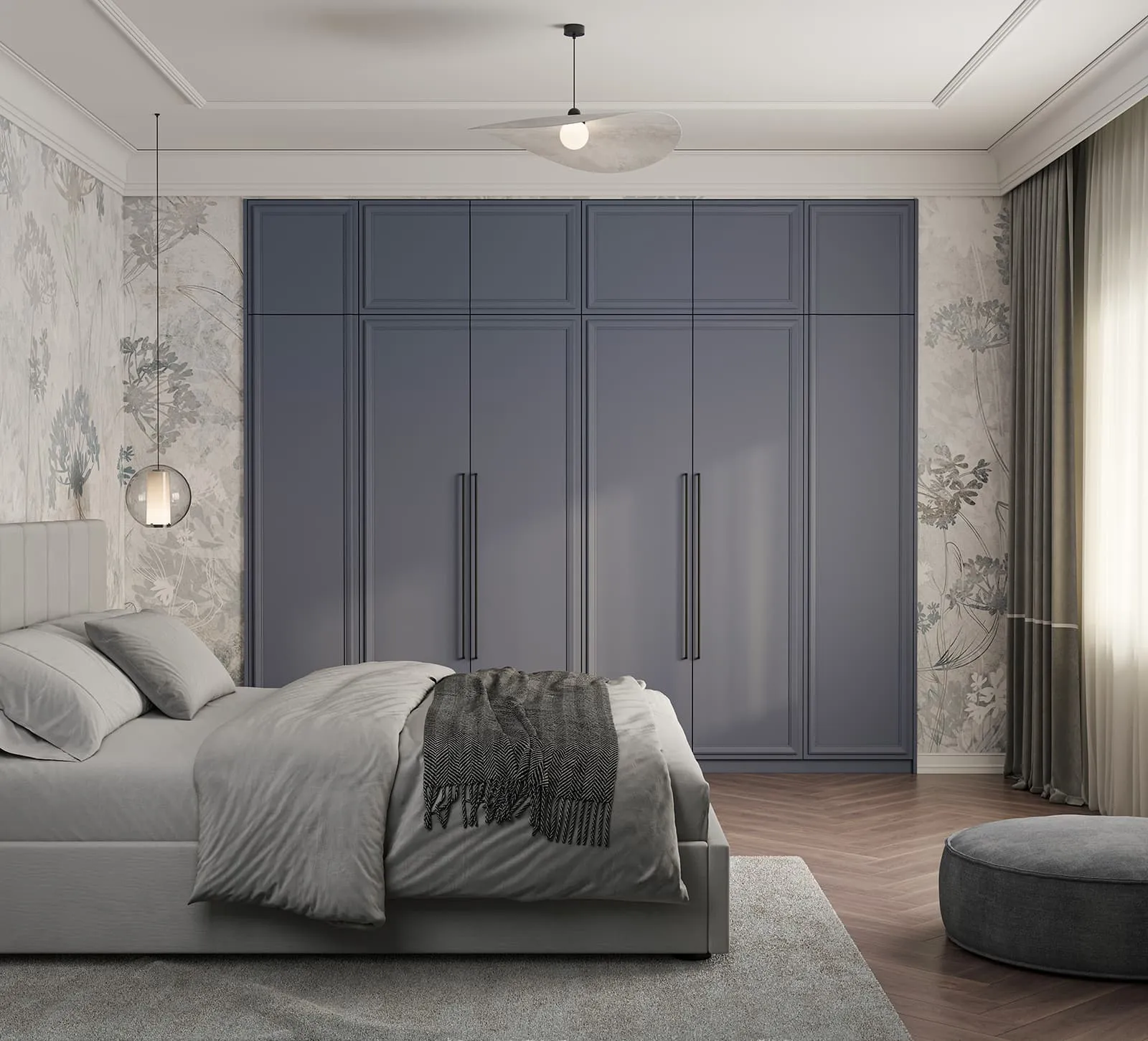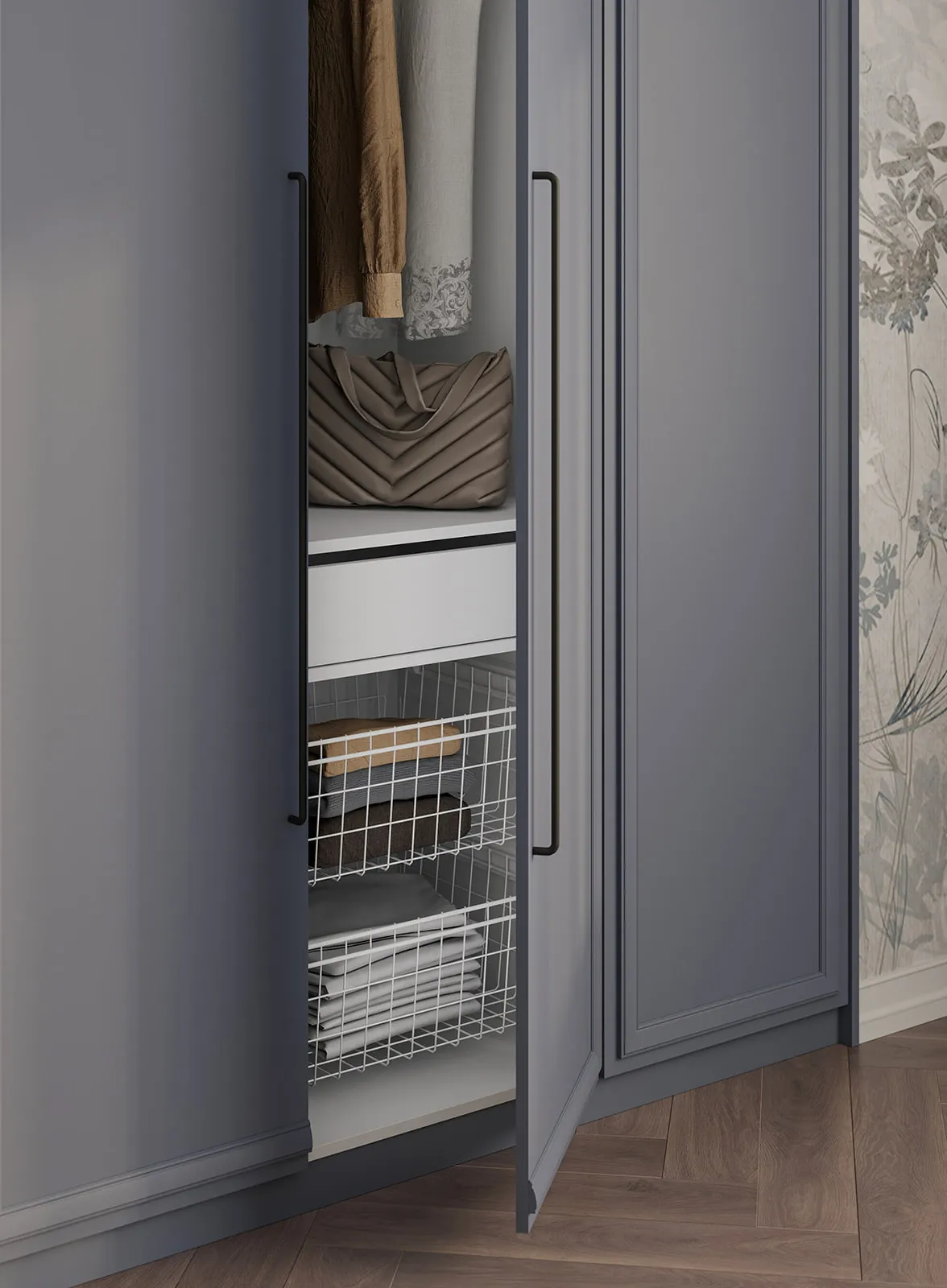 Фасады: Т648 Крашеная МДФ / массив ольхи, цвет NCS S 4020-R90B Матовый Каркас, полки, выдвижные ящики / задняя стенка:ЛДСП Белый Премиум / Белый Цены носят справочный характер