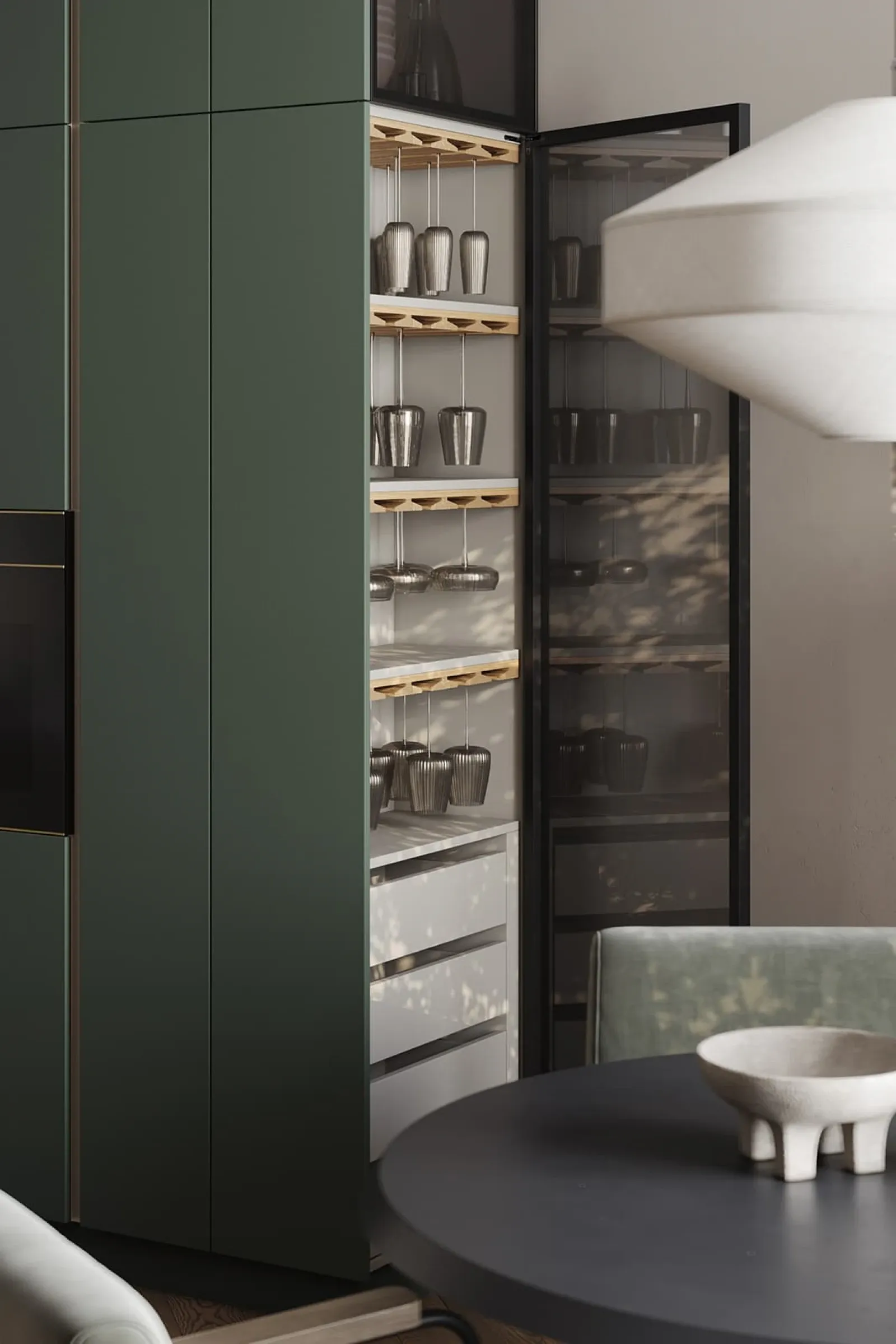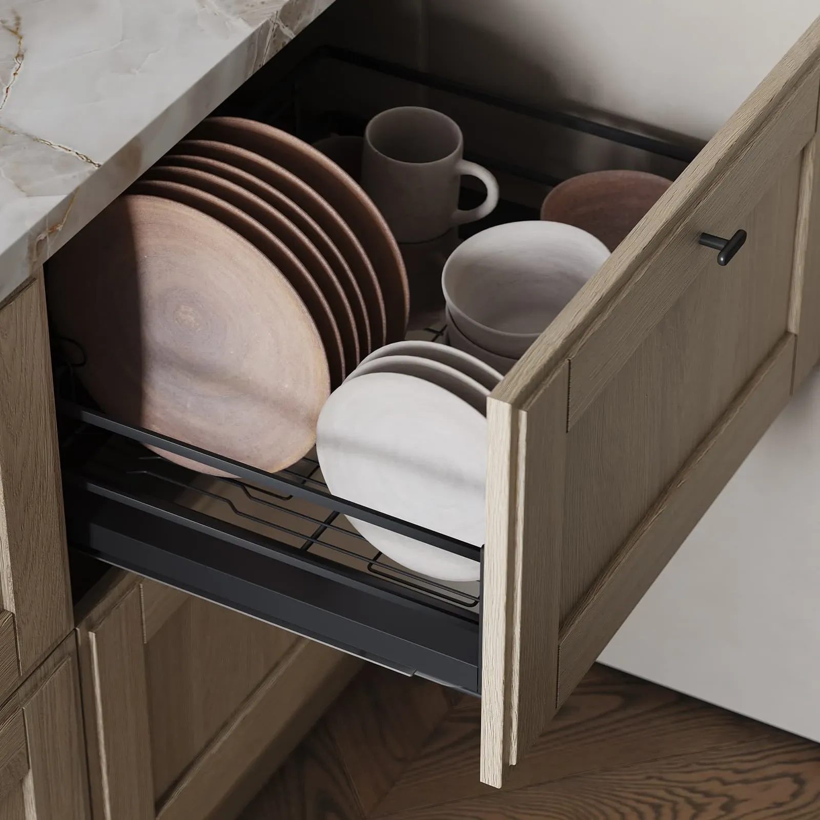Аксессуары: Сушка для посуды в выдвижной ящик Mira, выдвижная система МОК (тип 1, массив дуба/шпон дуба), держатели для бокалов с крепежной планкой (массив дуба/шпон дуба)