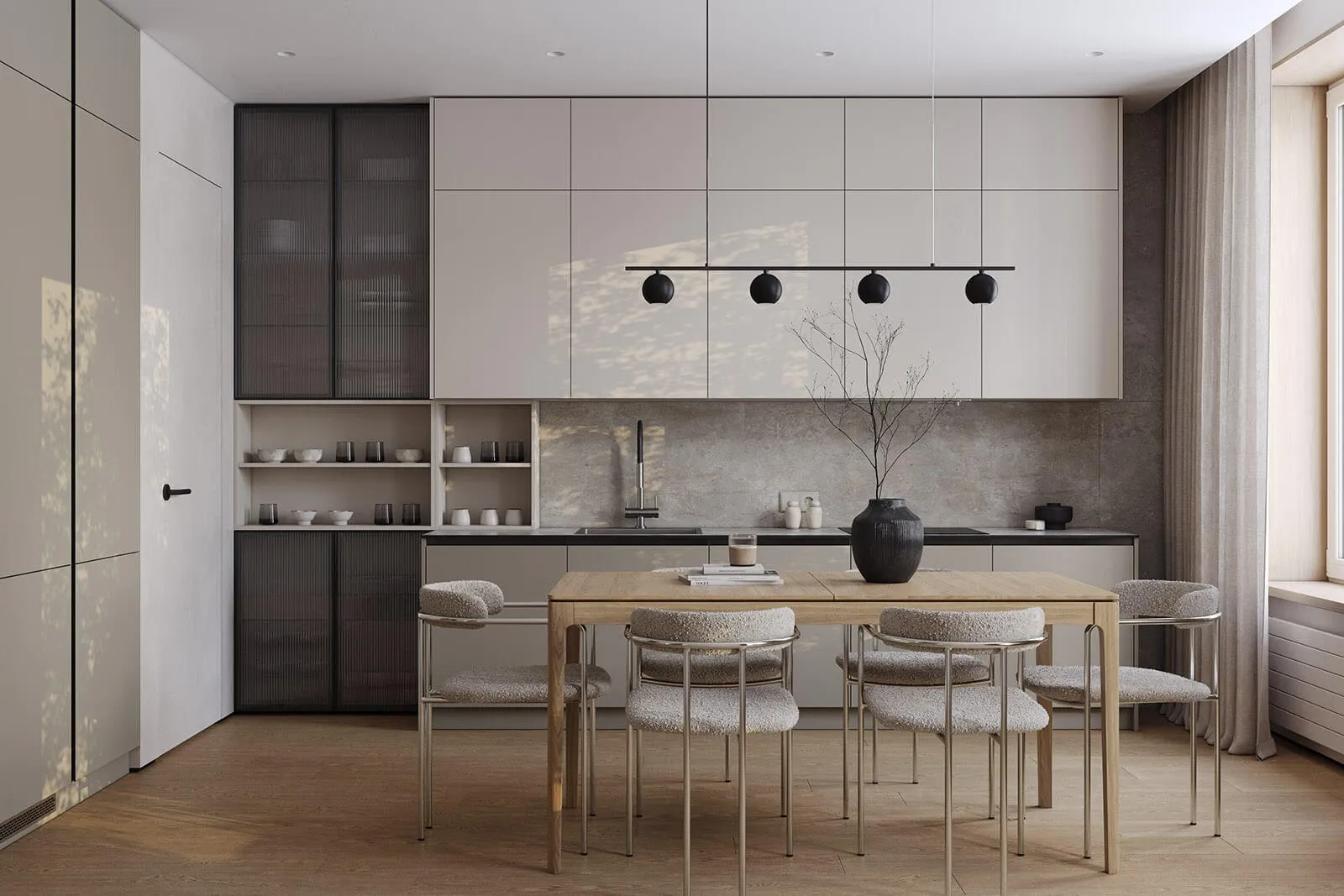 Витрины: Алюминиевый профиль А-6 Черный Матовый (скрытая петля AIR PUSH), стекло Тисненое-4 Графит прозрачное